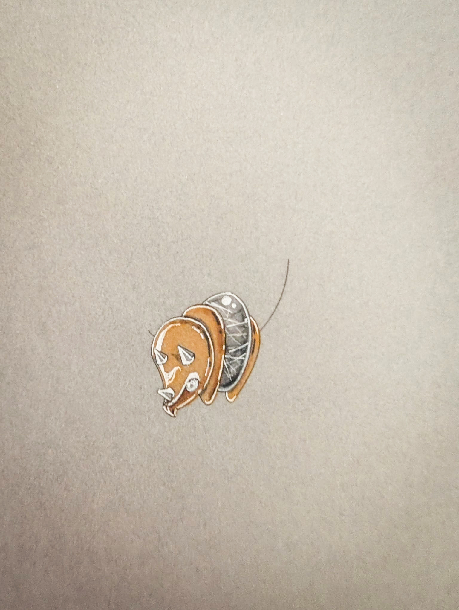 Design de boucles d’oreilles haute joaillerie « tricératops ». Tracés vectoriels, impression sur calque, puis mise en couleur au feutre et micro-pointe blanc.