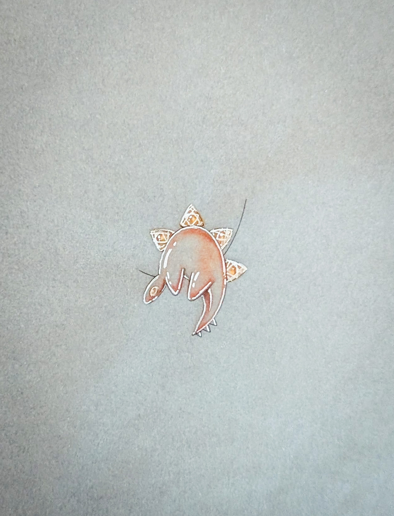 Design de boucles d’oreilles haute joaillerie « stégosaure ». Tracés vectoriels, impression sur calque, puis mise en couleur au feutre et micro-pointe blanc.